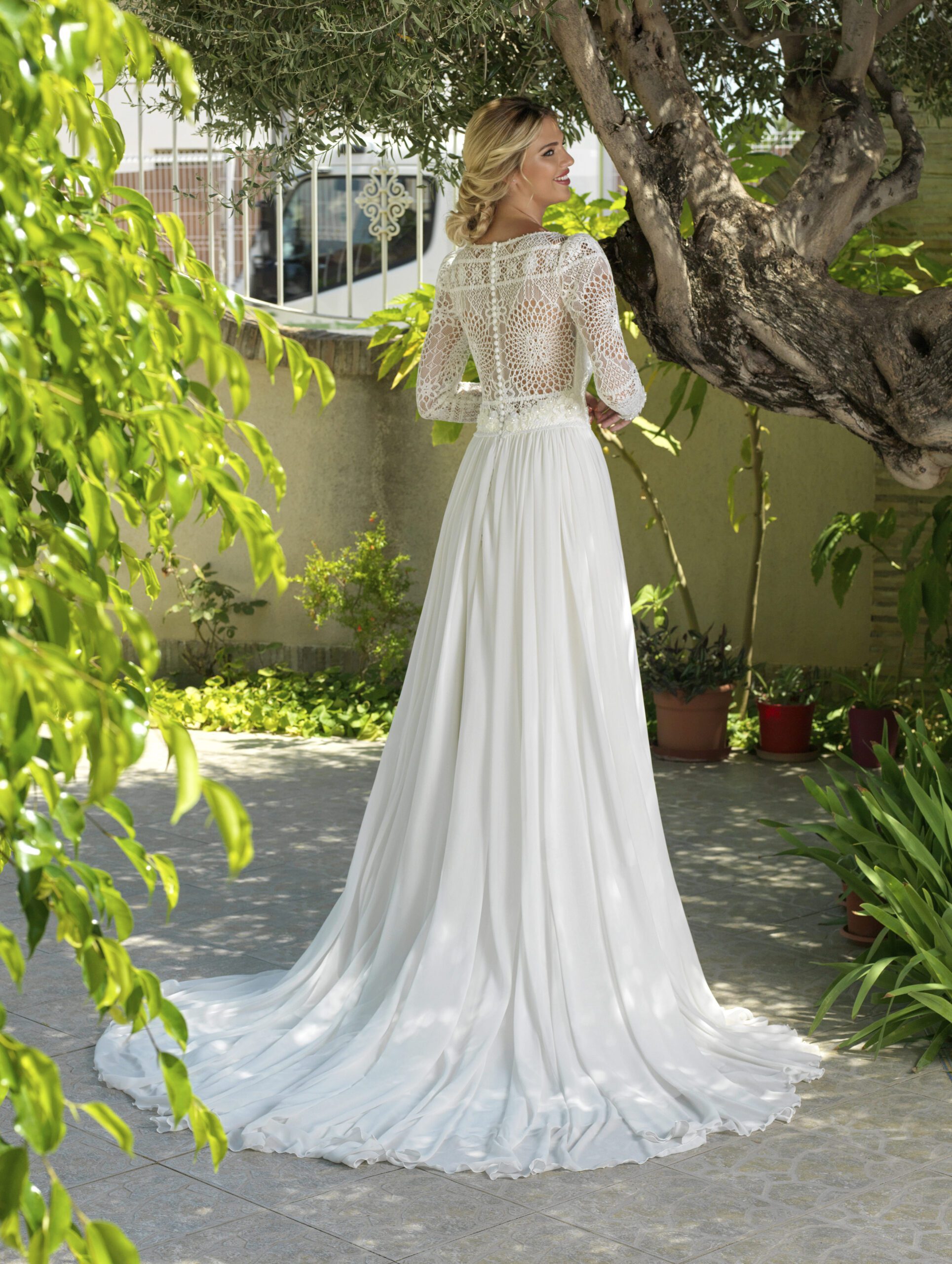 Vestido de amplio vuelo con falda rizada en gasa y cuerpo en rebrodé de manga larga. Escote de transparencia en corazón y apliques de pedrería en 39.