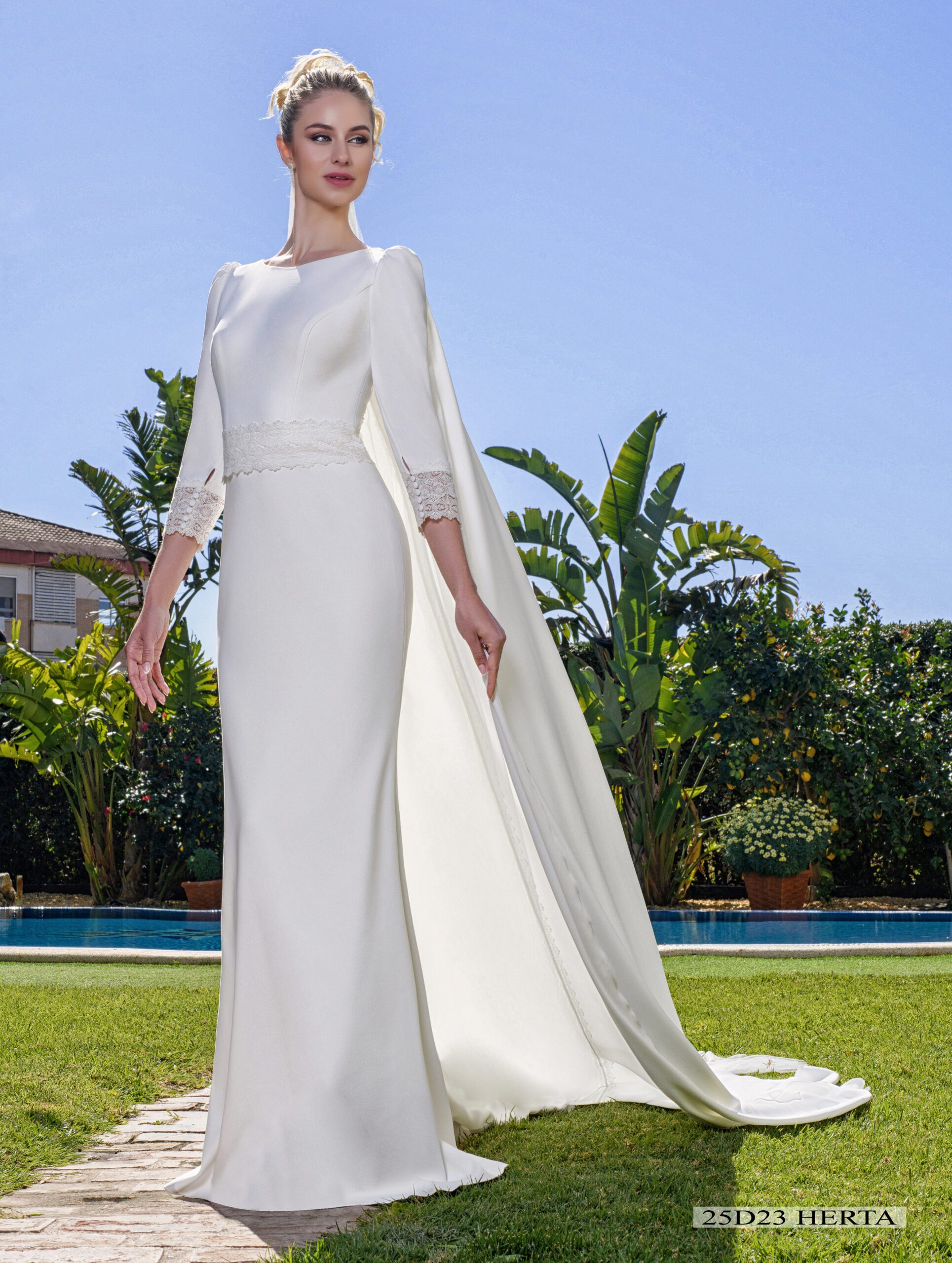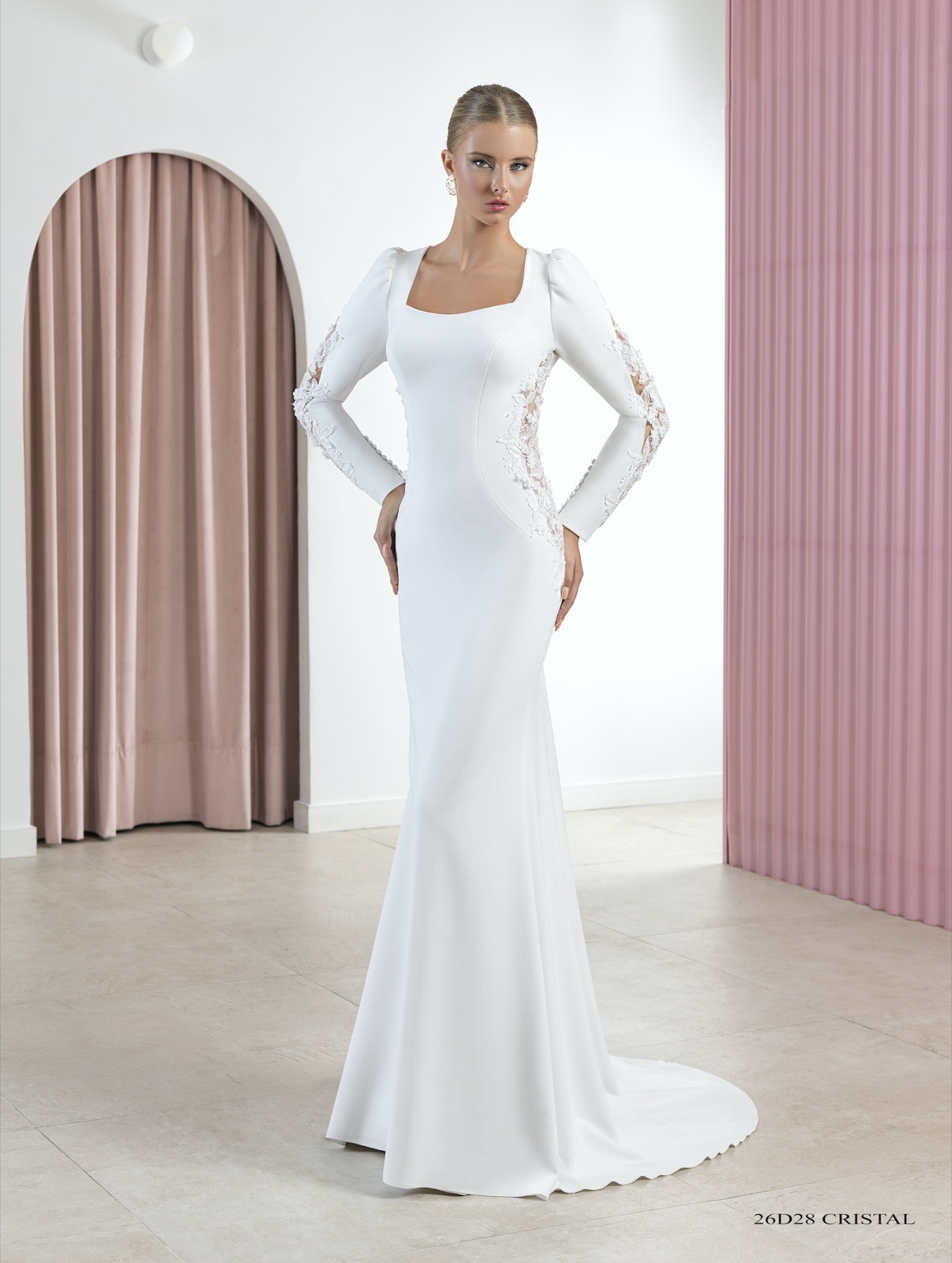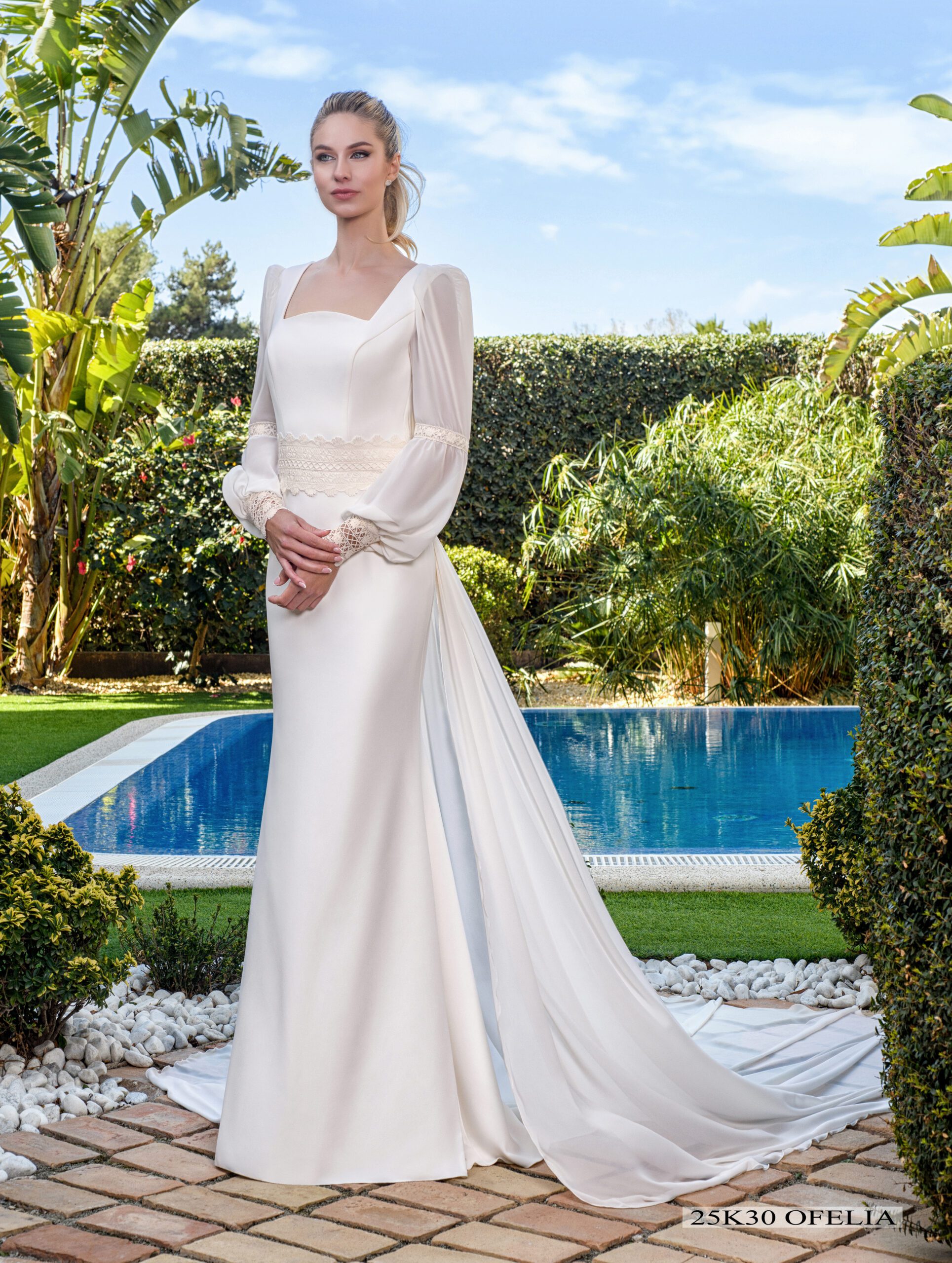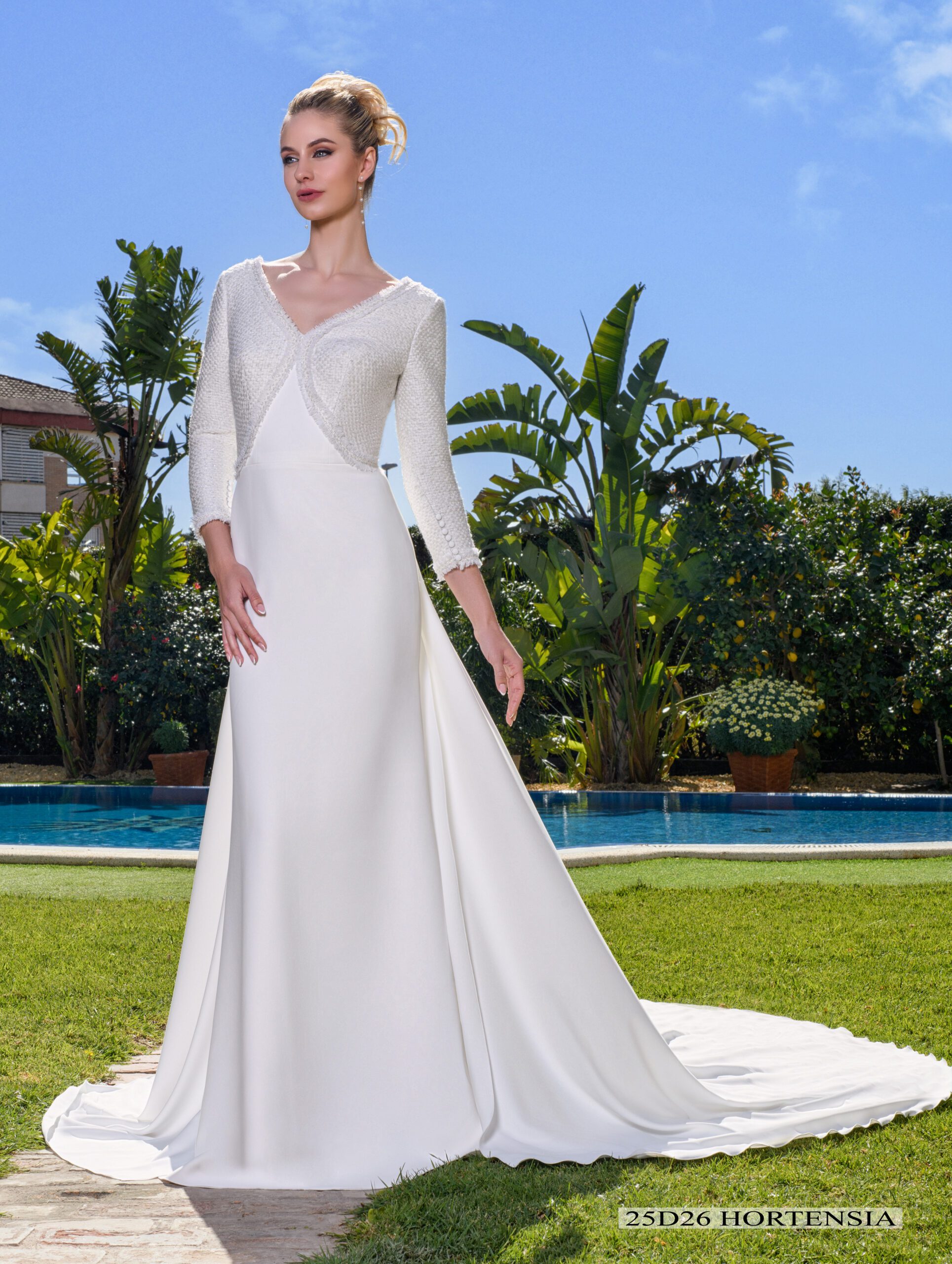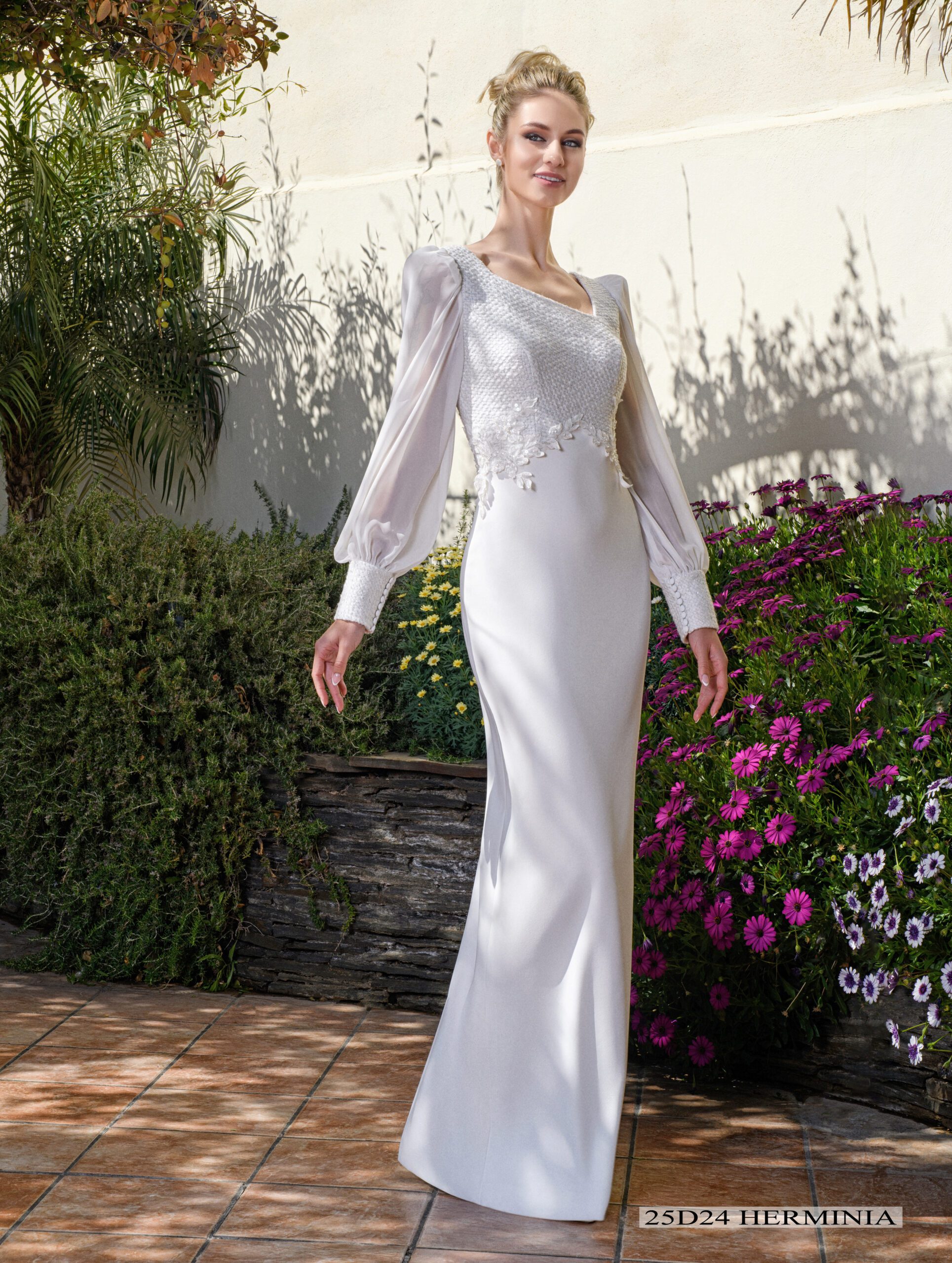 Vestido que realza la figura con escotes cuadrados y mangas con vuelo arriba y puño pesado con tul bordado de algodón y botones de perla con fantasía.