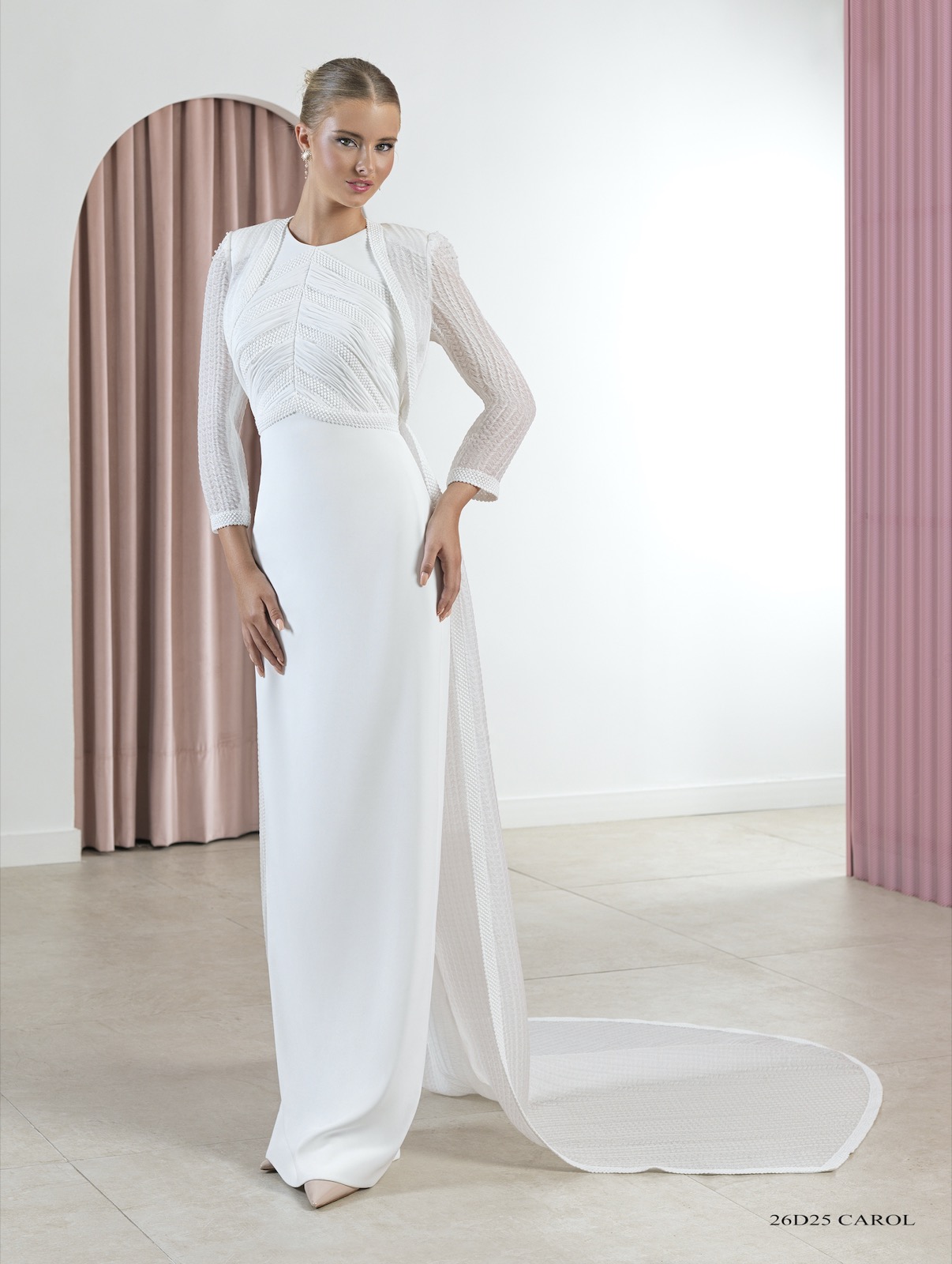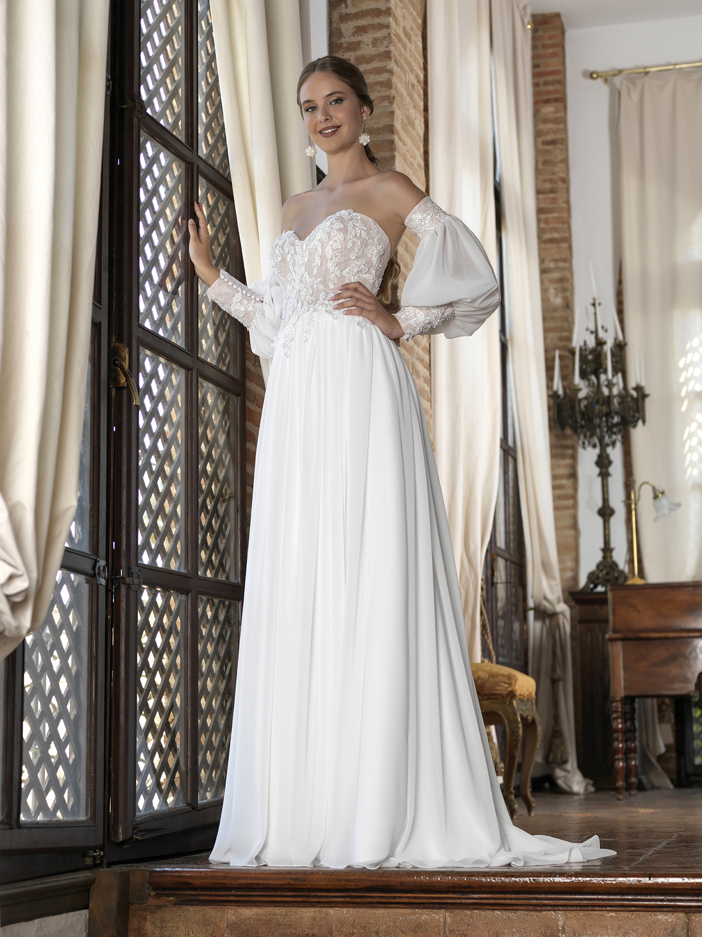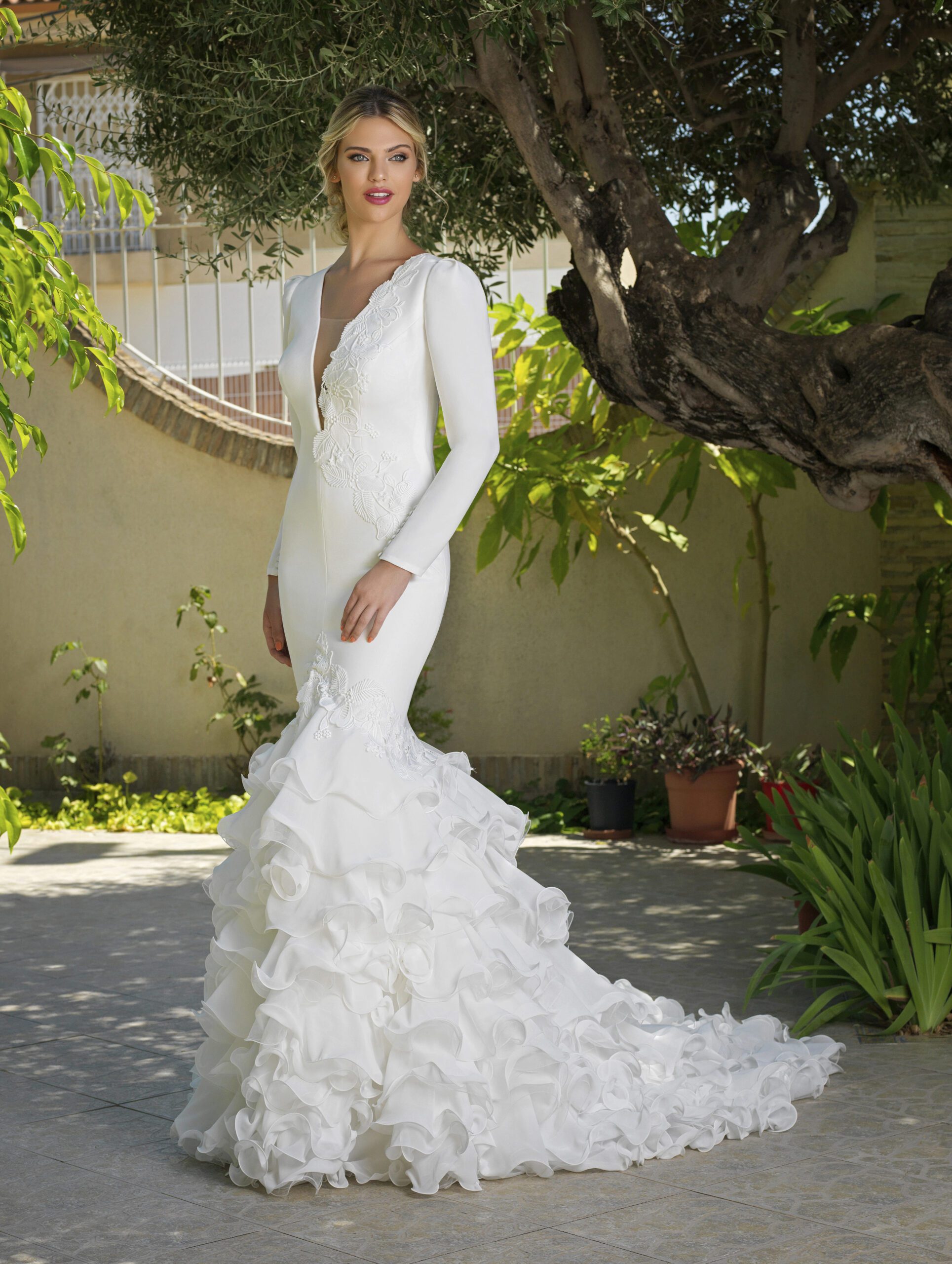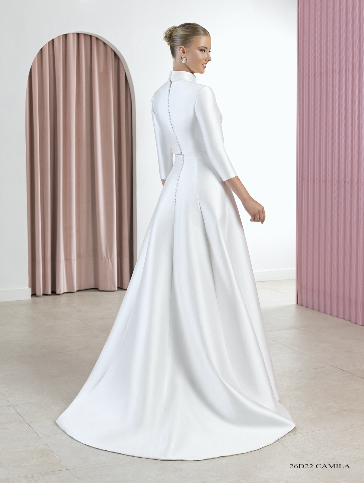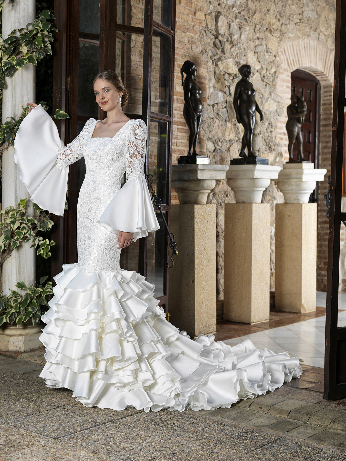 Vestido que realza la figura con escotes cuadrados y mangas con vuelo arriba y puño pesado con tul bordado de algodón y botones de perla con fantasía.