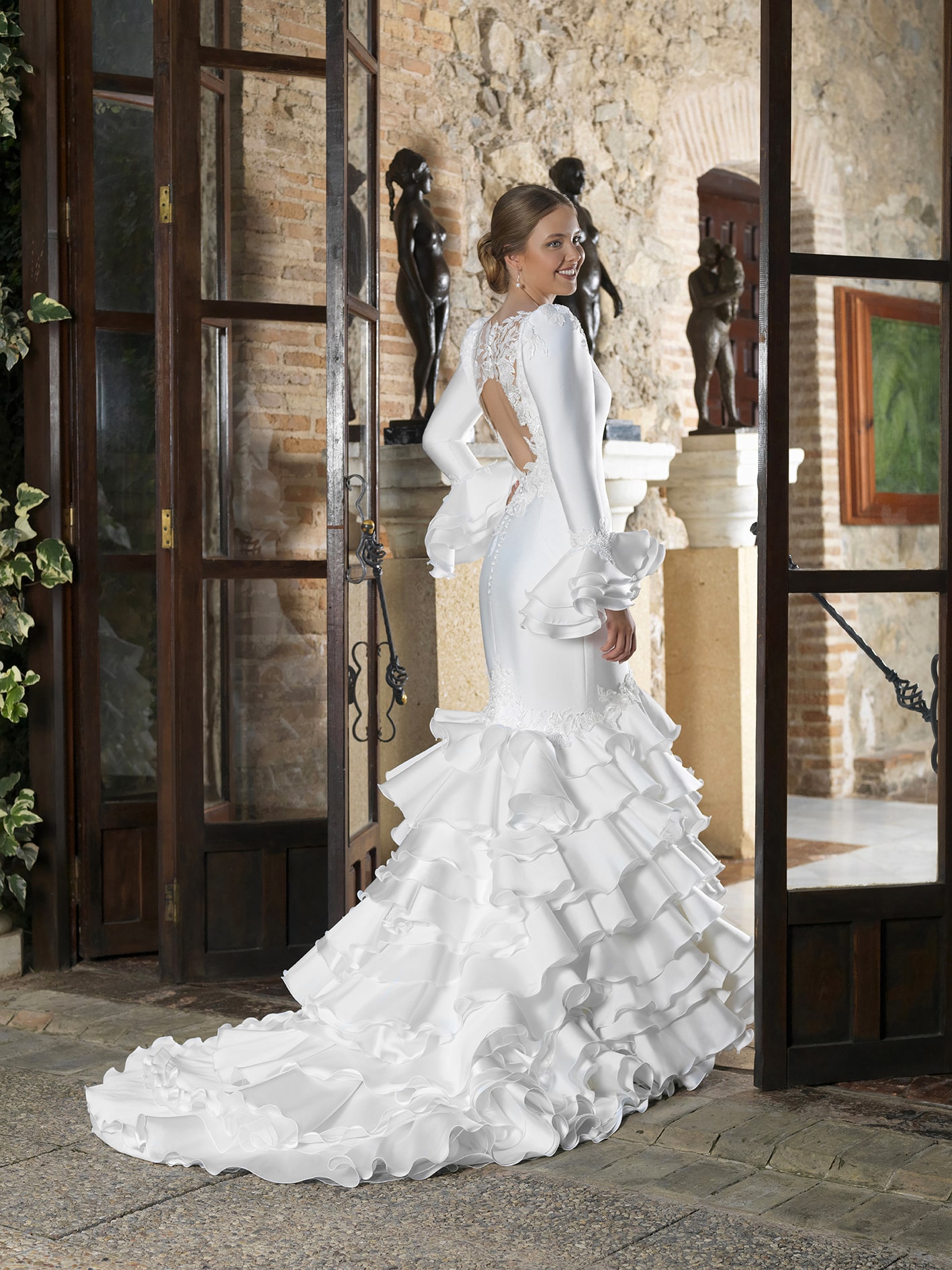Vestido de corte andaluz ceñidisimo al cuerpo, todo realizado en mikado liso con apliques bordados en pedrería. Escote de corazón y lágrima transparente en espalda.