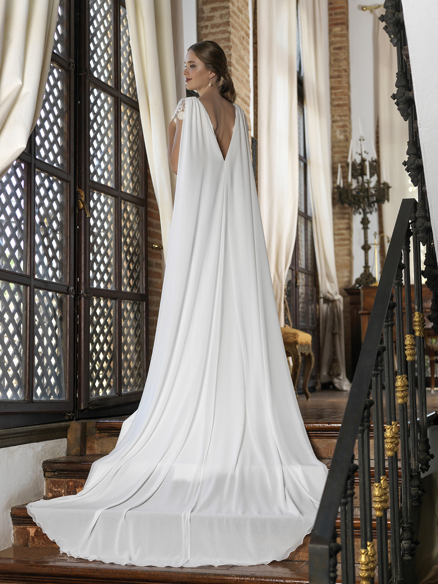 Vestido de corte A realizado en crep con adorno de puntilla bordada en color tostado en el talle y manga solo cubriendo el hombro. Capa desde hombros doble de gasa y larga cola.