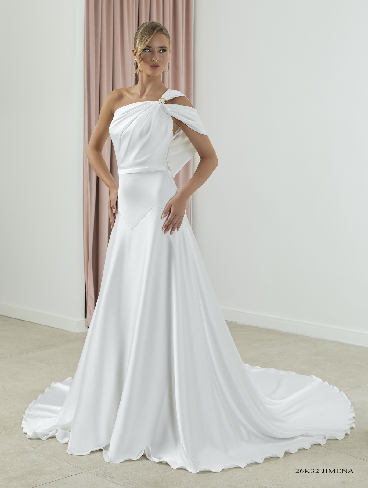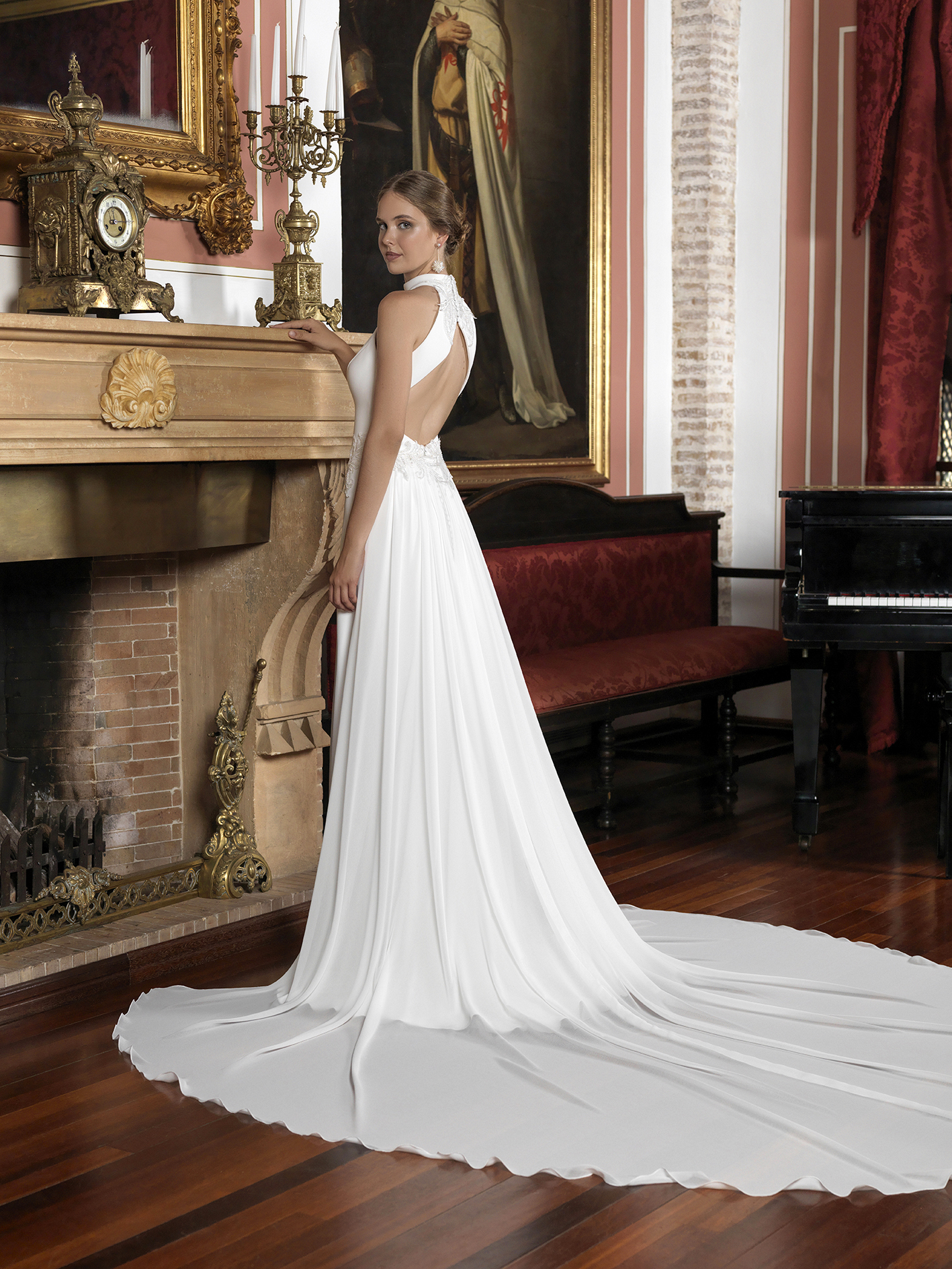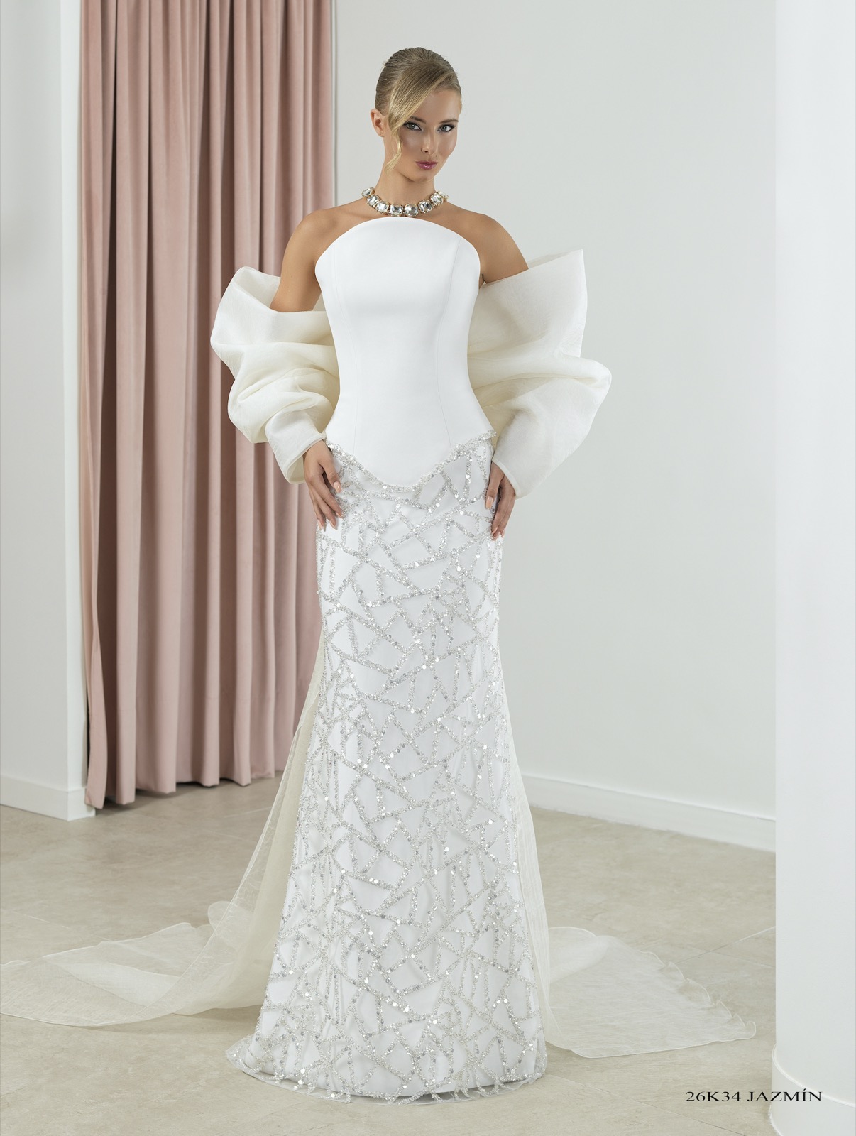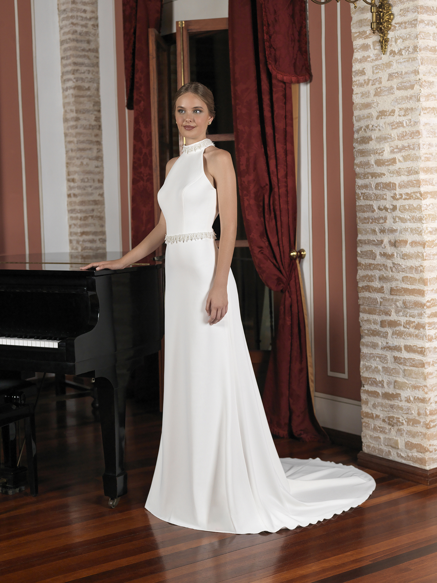 Vestido entallado de corte asimétrico con raja a un lado realizado en crep de neopreno y apliques de pedrería en el talle. Escote “Halter” y cruzado en espalda. Sobrecola de gasa en espalda.