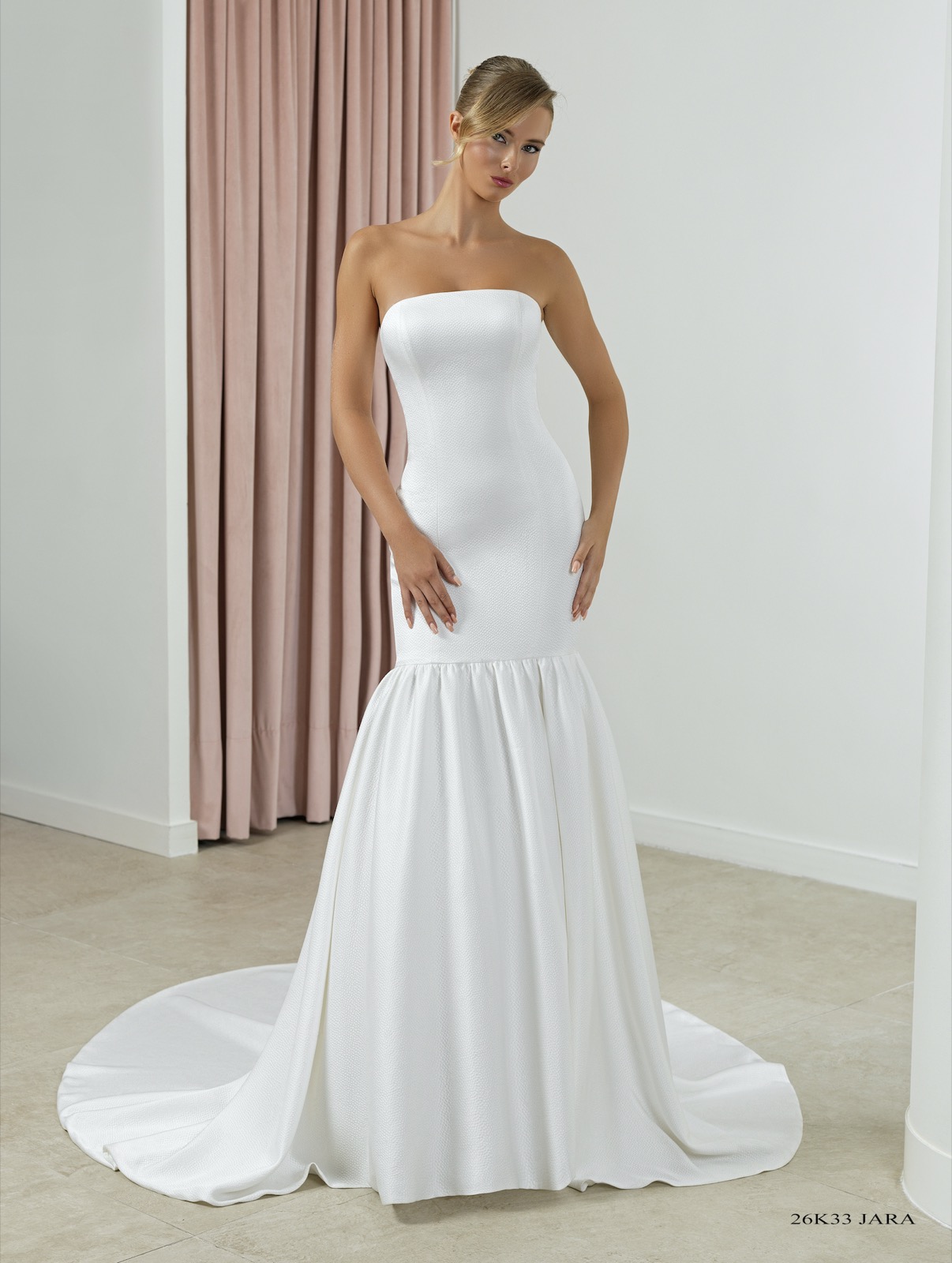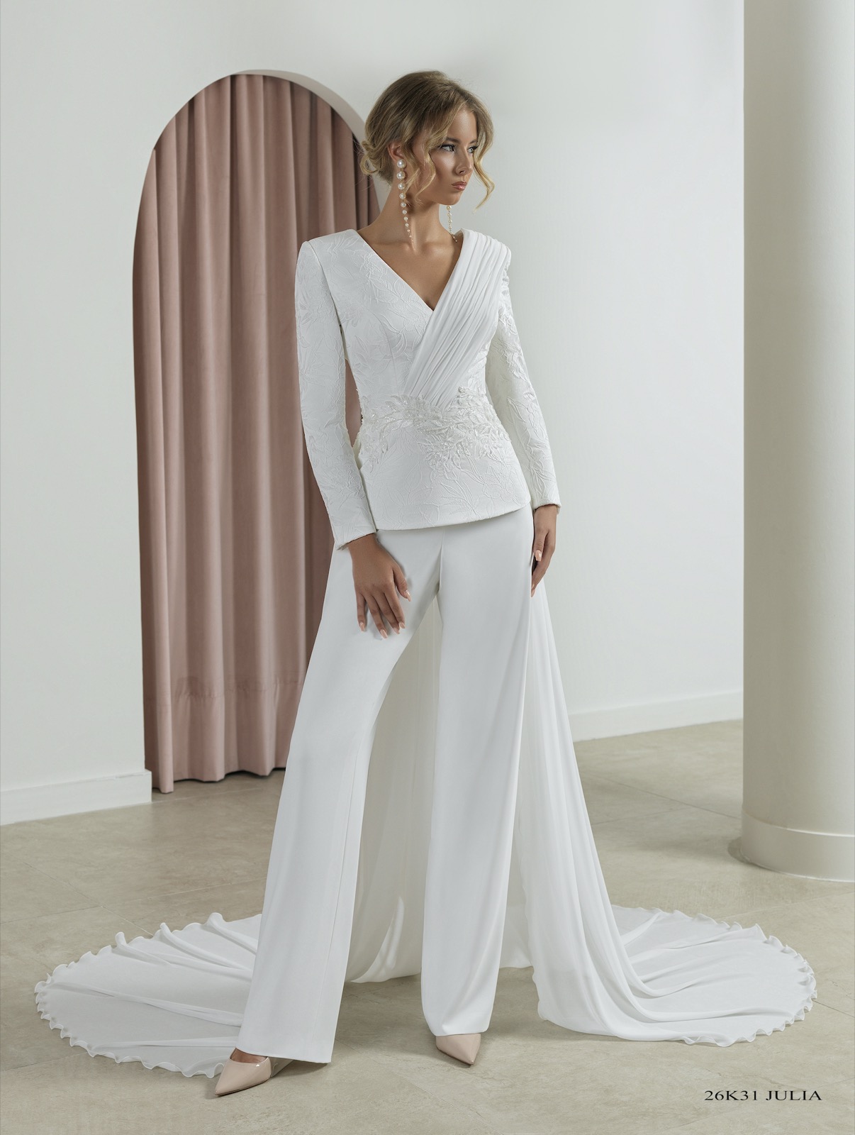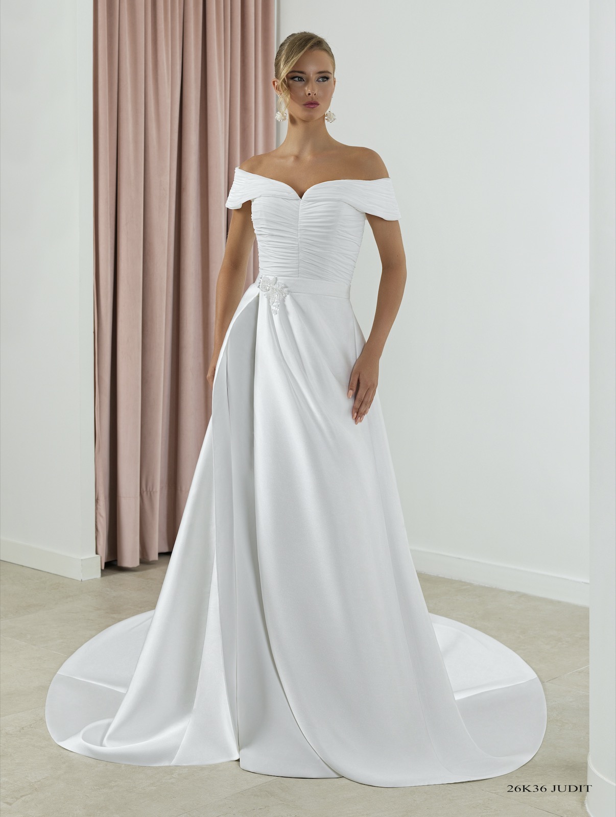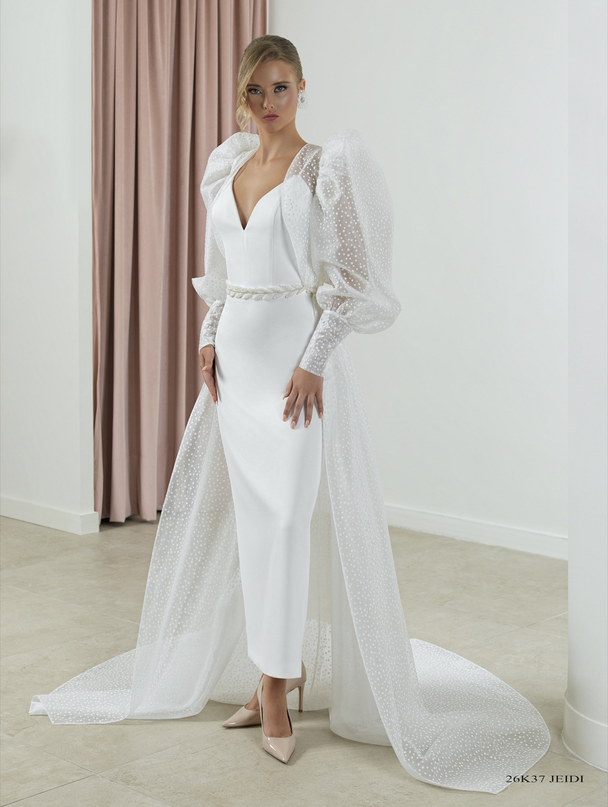 Vestido entallado de corte asimétrico con raja a un lado realizado en crep de neopreno y apliques de pedrería en el talle. Escote “Halter” y cruzado en espalda. Sobrecola de gasa en espalda.