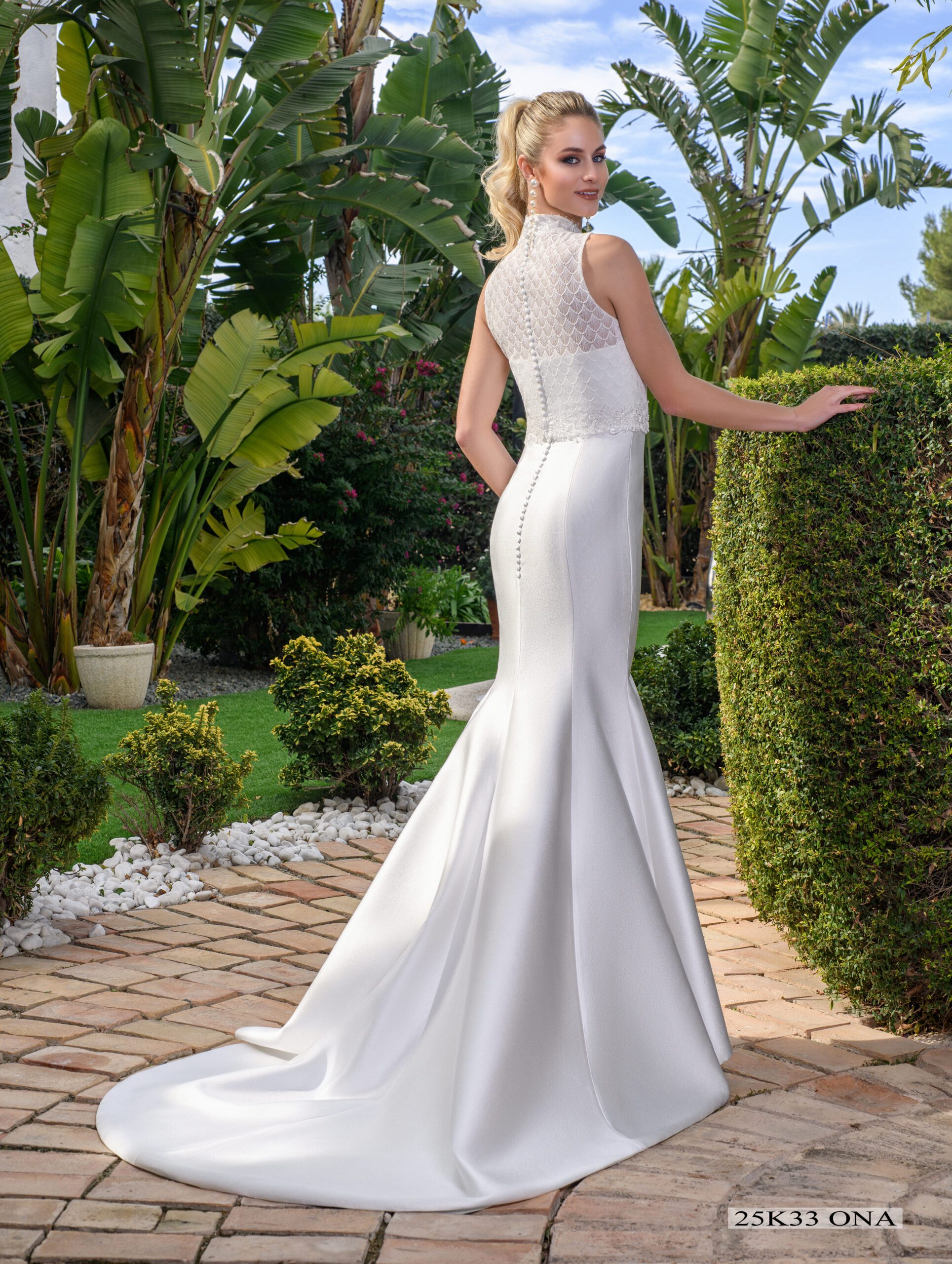 Vestido tipo sirena en palabra de honor realizado en tejido de microtextura que combina la flor gigante con torera en tul bordado sin mangas semitransparente.