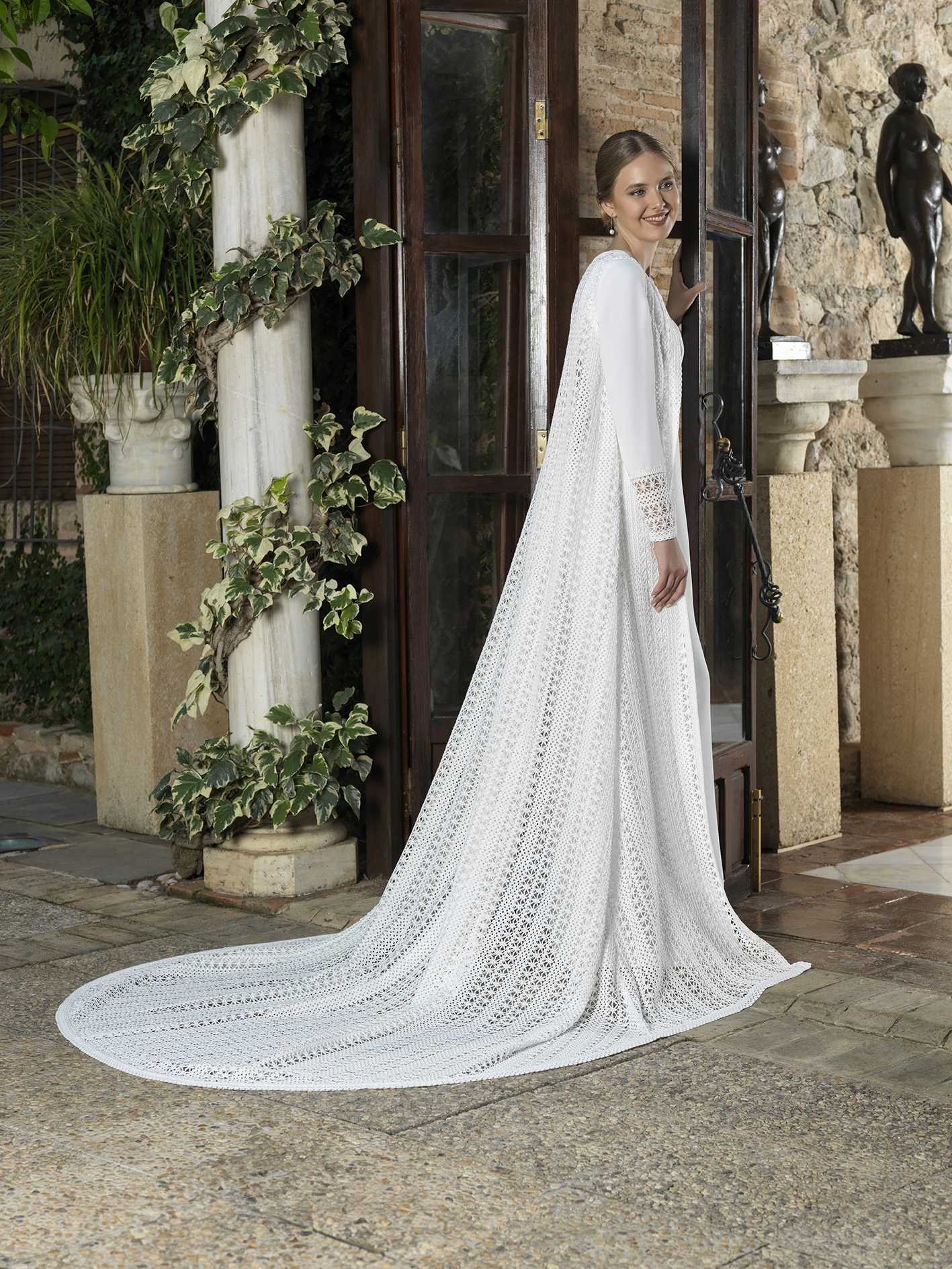 Vestido recto sin cola con escote cuadrado delante y detrás. Manga pegada francesa con adorno en puño y lo complementa un chaleco sin mangas de larga cola realizado en macrame.