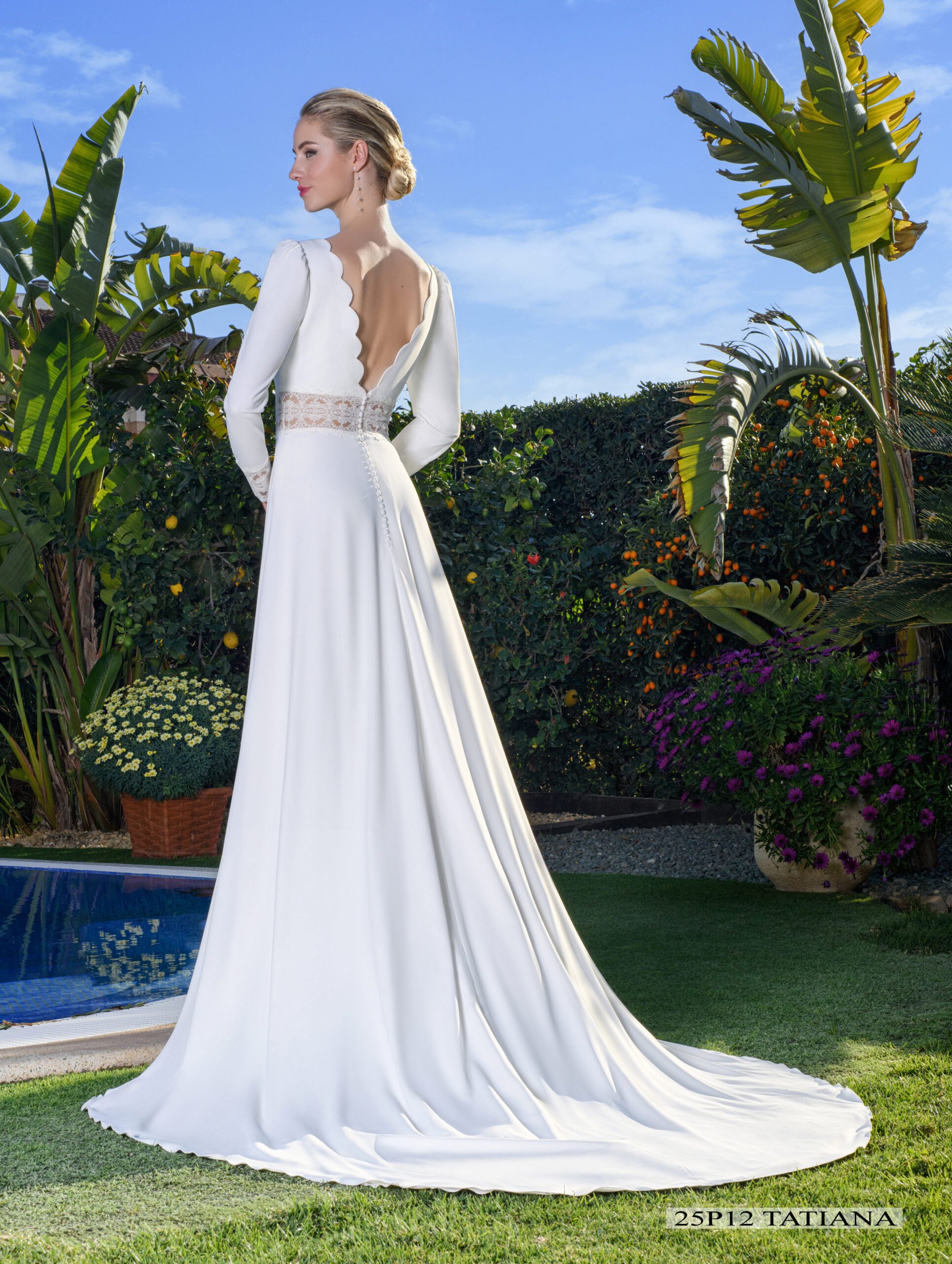 Elegante vestido con ondas realizadas en el mismo biocrep que forman el escote de barco delante y pico trasero. Cintura y puños adornados con finas puntillas