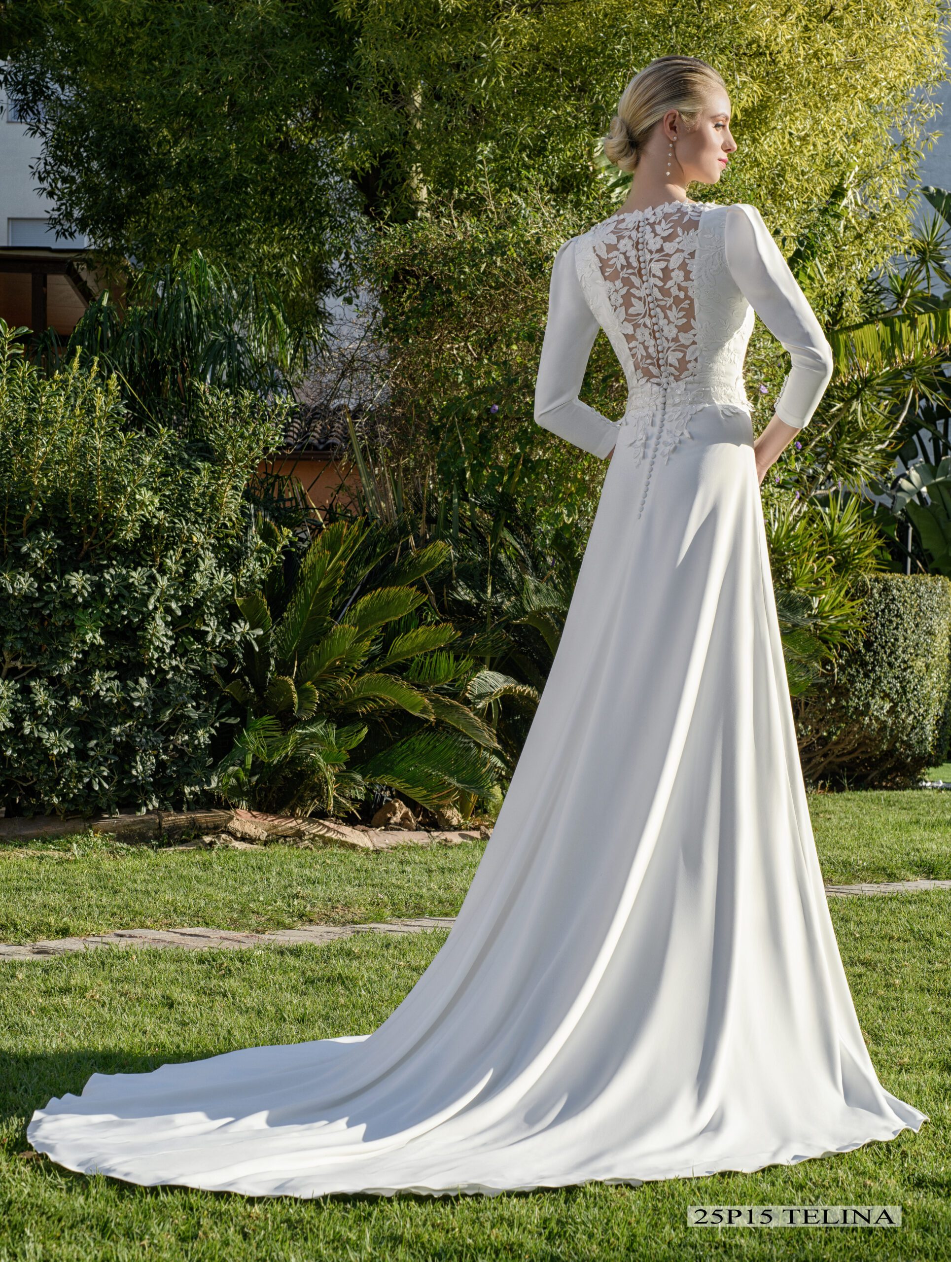 Vestido con atrevida abertura en falda con botones de fantasía a juego con el cuerpo en bordado de pallettess italiano con transparencia en escote trasero y manga francesa.