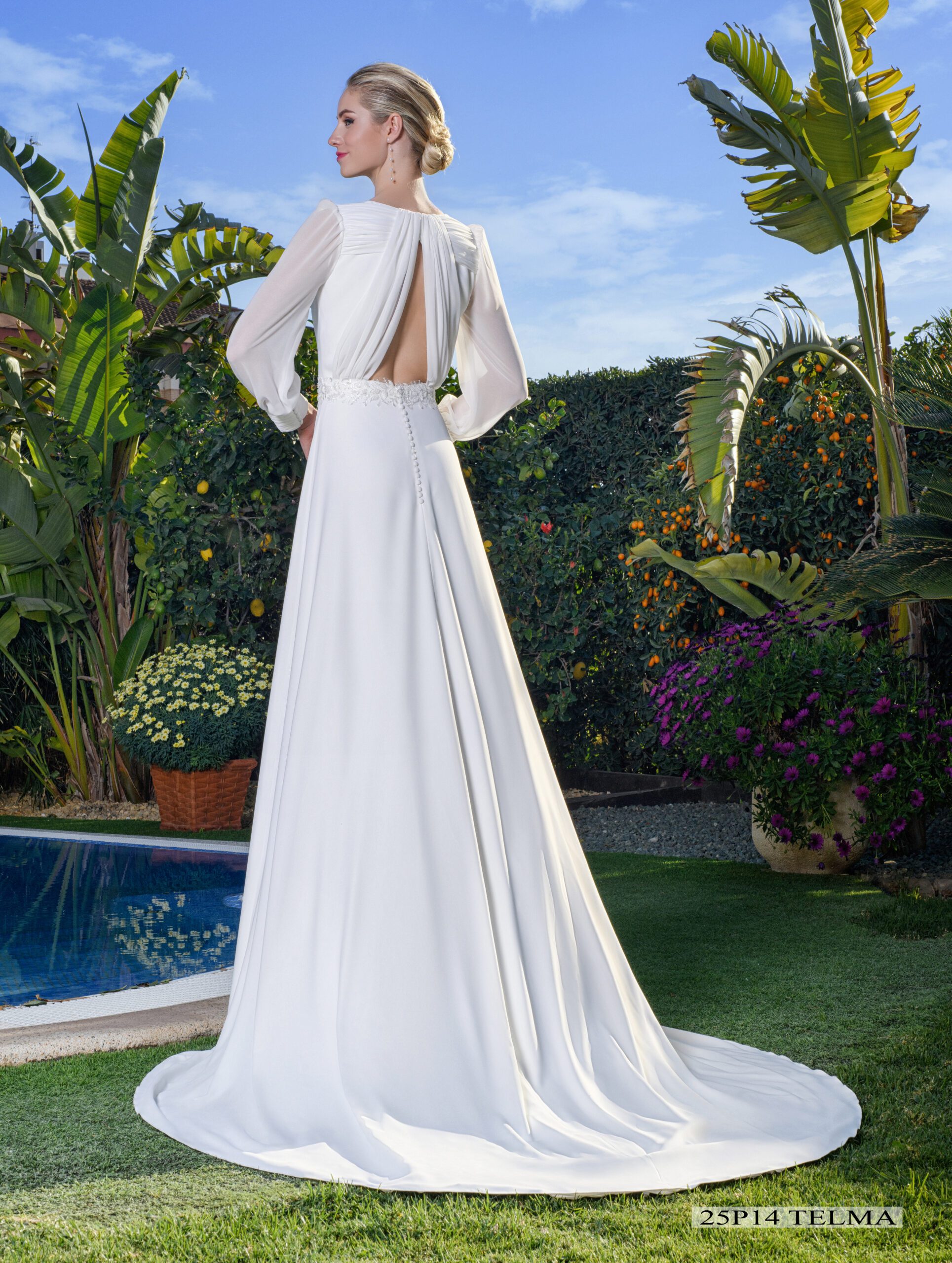 Este juvenil vestido combina la gasa y el crep haciendo trabajos de drapeado en puños y espalda jugando con transparencias y sutil pedrería en cintura.