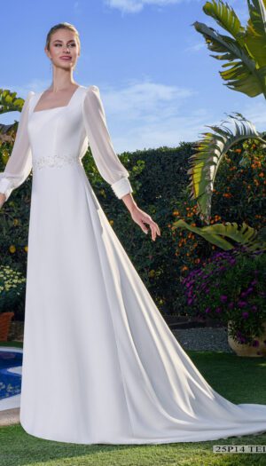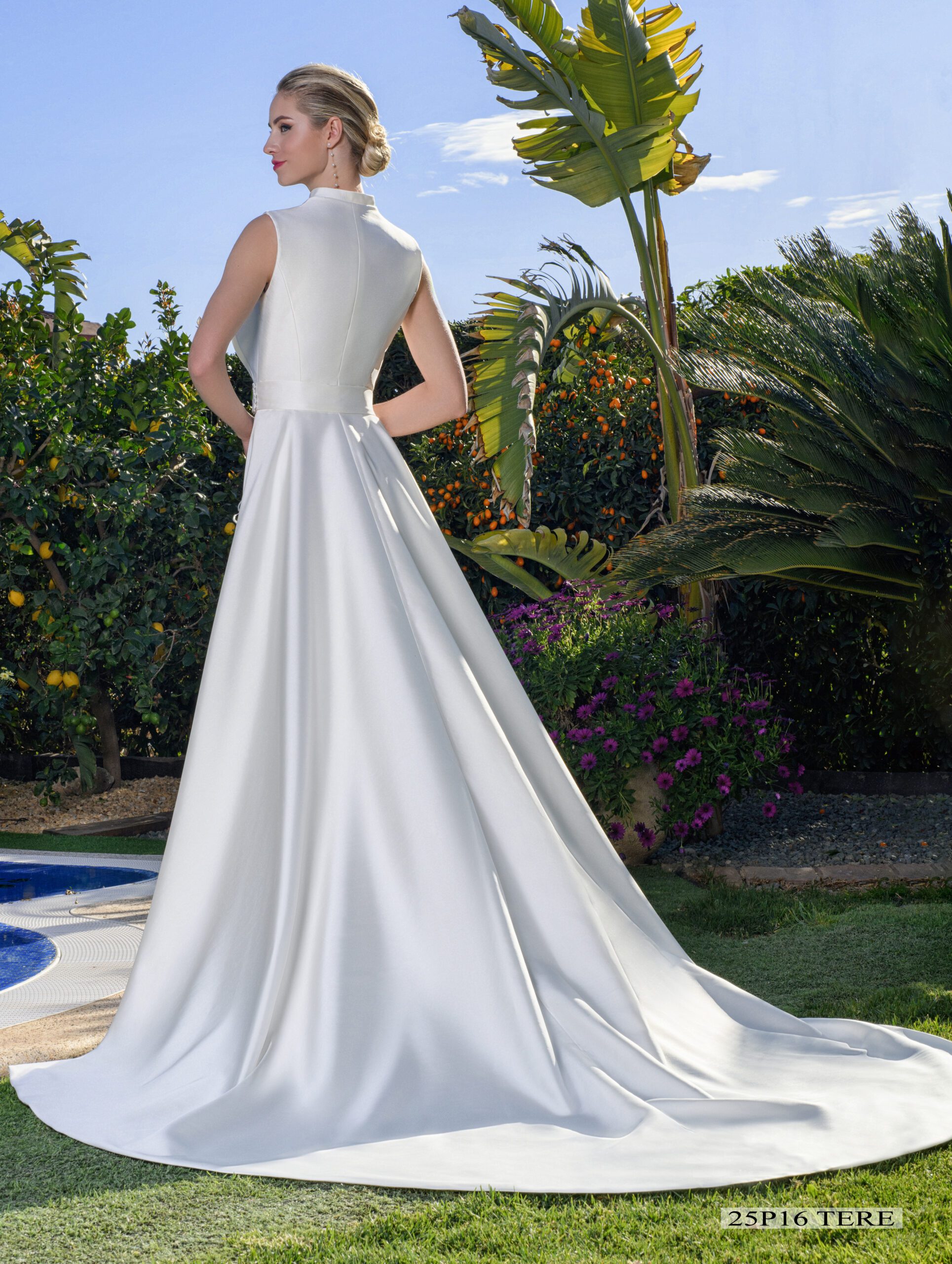 Espectacular vestido con riquísimo bordado que combina el cristal con plumas al aire y chaleco con cola todo desmontable realizado en micado de microtextura.