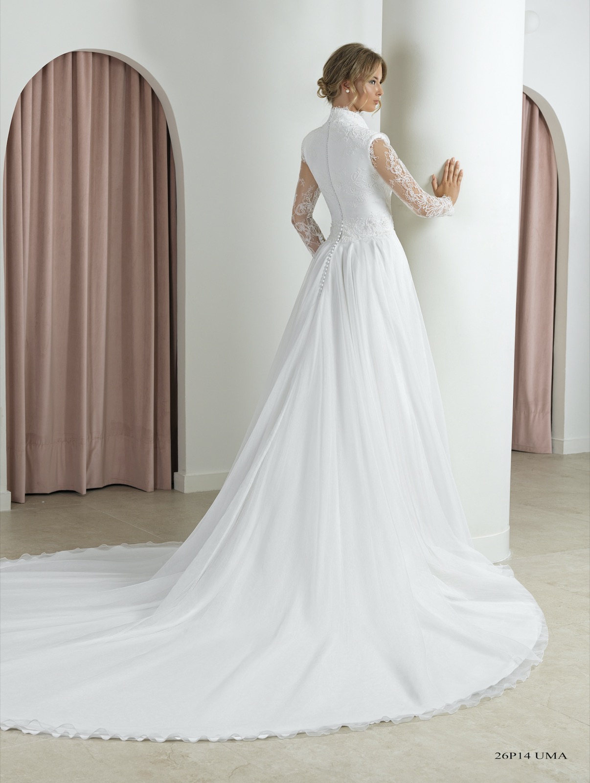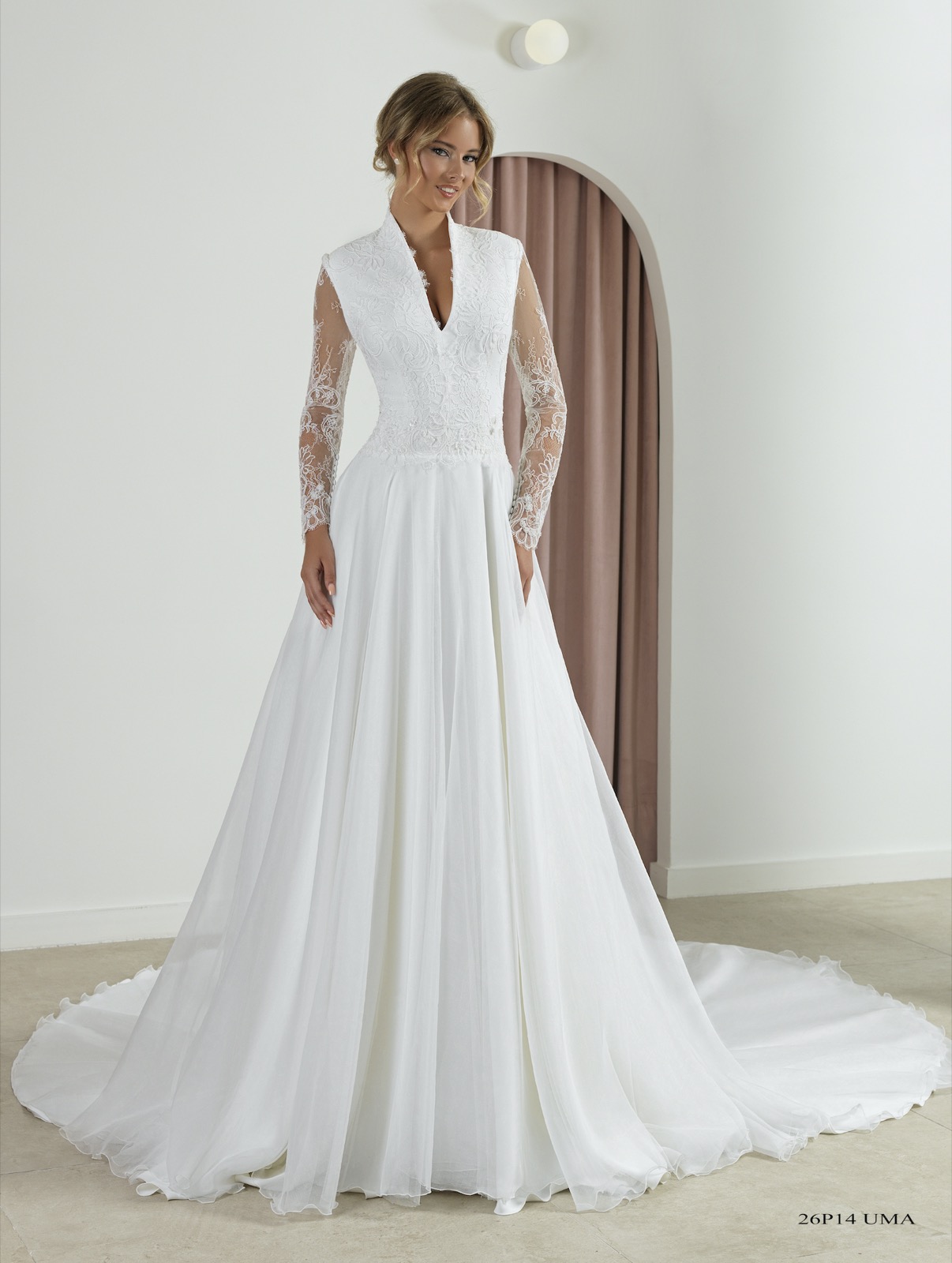 Cuerpo con escote al cuello y prufundo pico delantero, todo todo confeccionado en un rico Rebrodee francés y mangas transparentes.